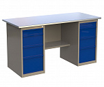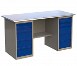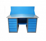 Двухтумбовый. Допустимая нагрузка на столешницу 1000 кг. Опорные элементы выполнены сварными из холоднокатаной стали. Для выполнения сборочных, ремонтных, слесарных, монтажных и других видов работ на производстве, в сервисных центрах, мастерских, гаражах, а также для обучения технологии в учебных заведениях. Комплектуется полкой-стенкой, расположенной под столешницей для удобного размещения габаритного инструмента и оснастки. Размеры верстака: 855x1596x696 мм. Вес: 98 кг. Поставляется в 4 комплектациях на выбор.