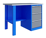 Однотумбовый. Допустимая нагрузка на столешницу 750 кг. Опорные элементы выполнены сварными из холоднокатаной стали. Верстак состоит из столешницы, опоры, тумбы P3 с тремя большими ящиками, полки-стенки и одинарного экрана с кронштейнами. Все металлические элементы покрыты полиэфирной порошковой краской. Столешница состоит из фанеры марки ФСФ толщиной 24 мм, которая покрыта лаком-антисептиком и листом оцинкованной холоднокатаной стали толщиной 1,2 мм. Размеры (ВхШхГ) 1470x1196x696 мм.
