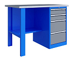 Верстак однотумбовый поставляется в разобранном виде. Нагрузка на столешницу до 600 кг. Стандартный цвет: корпус - серый глянец RAL 7030, ящики и двери тумб - синий RAL 5017. Размеры:855x1400x700 мм. Вес: 62 кг.