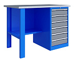Однотумбовый. Допустимая нагрузка на столешницу 750 кг. Опорные элементы выполнены сварными из холоднокатаной стали. Верстак состоит из столешницы, опоры, тумбы P7 с дверью и двумя полками, полки-стенки, двойного экрана с кронштейнами. Все металлические элементы покрыты полиэфирной порошковой краской. Столешница состоит из фанеры марки ФСФ толщиной 24 мм, которая покрыта лаком-антисептиком и листом оцинкованной холоднокатаной стали толщиной 1,2 мм. Размеры (ВхШхГ) 1965x1196x696 мм.
