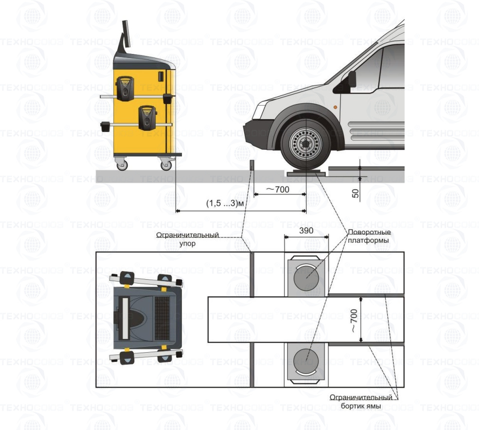 Работа стенда возможна на 4-х стоечном подъемнике или на ремонтной яме, при обязательном соблюдении требовании по горизонтальности. Данная модификация стенда поставляется без компьютерной стойки, что позволяет более гибко организовать рабочее место и значительно сэкономить рабочее место в автосервисе.