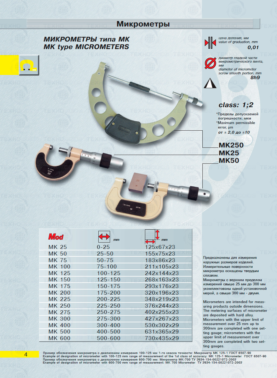 Цена деления 0,01 мм. Диапазон измерения от 275-300 мм. Для измерения наружных размеров изделий. Измерительные поверхности микрометра оснащены твердым сплавом. Микрометры укомплектованы одной установочной мерой. Класса точности 1. ГОСТ 6507-90. Поставляется в двух вариантах с поверкой и без поверки!