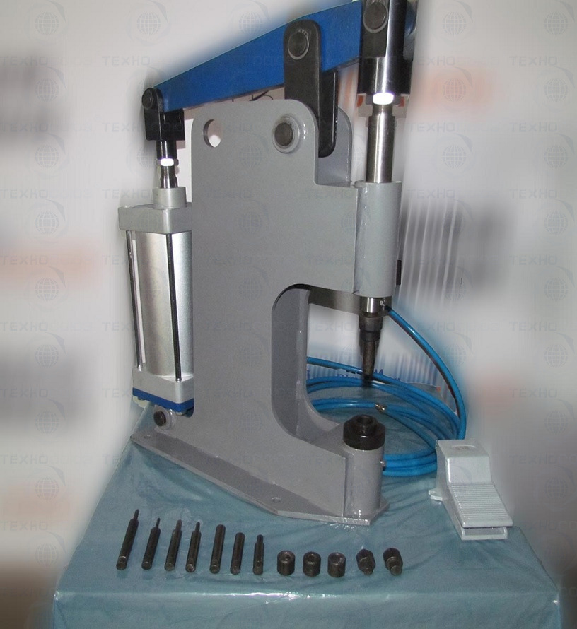 Клепальный пресс применяется при замене изношенных накладок при ремонте автомобилей на станциях технического обслуживания и автотранспортных предприятиях, имеющих пневмосеть. Тормозная колодка неподвижна, рабочий пуансон опускается сверху. Пуансоны легко заменяются, величину хода удобно настроить. Конструкция пресса проста и ремонтопригодна.